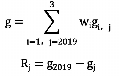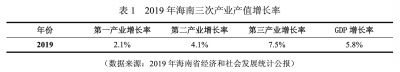 笔者以产业结构理论(英国经济学家科林·克拉克在《经济进步的条件》一书中总结了劳动力在三次产业中的结构变化与人均国民的提高存在着一定的规律性,劳动人口从农业向制造业、进而从制造业向商业及服务业的移动,即所谓克拉克法则)为研究基础,将2019年作为基准年(表1),通过左图所示公式进行产业结构变化对经济增长的变动率计算研究海南三次产业结构的合理性。