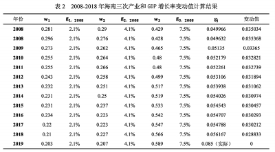 模型设定主要结合两方面因素的思考,一是三次产业中各产业增长率的大小,二是表1中各产业产值所占当年海南国内生产总值比重。若各个产业的产值保持不变的增长率,那么理论上海南整体GDP应该取决于各个产业在上一年所占GDP的比重,通过这种方式所计算出来的国内生产总值增长率若小于实际上的国内生产总值增长率,那么溢出部分便为当年海南产业结构对经济增长的贡献率,即变动率。其中,i代表三次产业,g代表海南理论上国内生产总值增长率(模型计算所得),w为第i产业所占当年国内生产总值的比重,gi,j为第i产业在j年的产值增长率。(计算结果见表2)