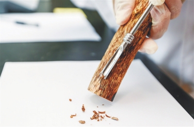 中国热科院生物所研究人员刮下结香木材的黑色油脂,为鉴定样品的真伪做准备。资料图片