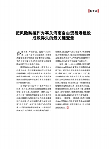 建设海南自由贸易港是一项前无古人的伟大创举,是引领我国新时代对外开放的鲜明旗帜,不仅关乎海南发展,也关乎中国改革开放全局。习近平总书记高度关注海南全面深化改革开放和自由贸易港建设的风险防控问题。