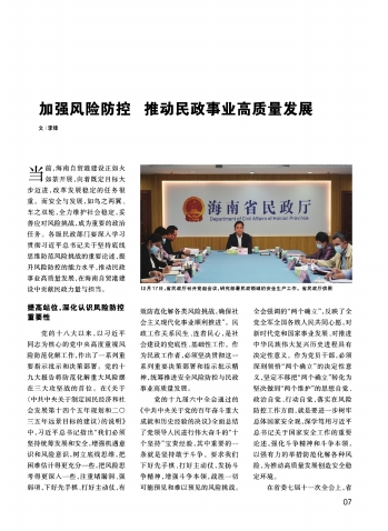 当前,海南自贸港建设正如火如荼开展,向着既定目标大步迈进,改革发展稳定的任务很重。而安全与发展,如鸟之两翼、车之双轮,全力维护社会稳定,妥善应对风险挑战,成为重要的政治任务。各级民政部门要深入学习贯彻习近平总书记关于坚持底线思维防范风险挑战的重要论述,提升风险防控的能力水平,推动民政事业高质量发展,在海南自贸港建设中贡献民政力量与担当。