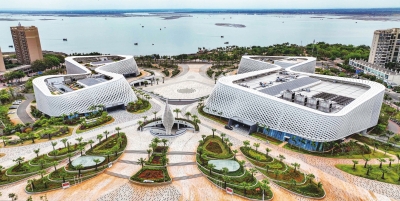 从2018年到2021年,洋浦保税港区的进出口总值从4亿元增长到364.7亿元,增长了90倍;经营总收入从1.5亿元,增长到2155亿元,增长了1429倍。图为高空俯瞰洋浦展示馆。陈元才/摄