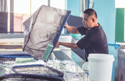 4月24日,工人在文昌市冯家湾现代化渔业产业园内作业。李天平/摄