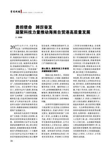 2024年12月17日,习近平总书记在三亚听取省委和省政府工作汇报时指出,要主动对接国家战略科技力量,加强国际科技合作,构建更加开放的引才机制,打造多层级科技创新体系,加大核心技术攻关力度,加强科技成果转化,因地制宜发展新质生产力。在2025年全国两会上,“科技创新”作为推动经济社会高质量发展的核心引擎,再次成为备受瞩目的高频词。习近平总书记三下团组,强调要“抓科技创新和产业创新融合”,为我国科技创新和产业升级指明了方向。在全省领导干部会议上,省委书记冯飞强调,要因地制宜打造新质生产力重要实践地,坚持“五向图强”,主动对接国家战略科技力量,打造多层级科技创新体系,扩大科技开放合作,支持企业牵头或参与国家和省级科技攻关任务,构建彰显海南自贸港辨识度的产业创新生态。