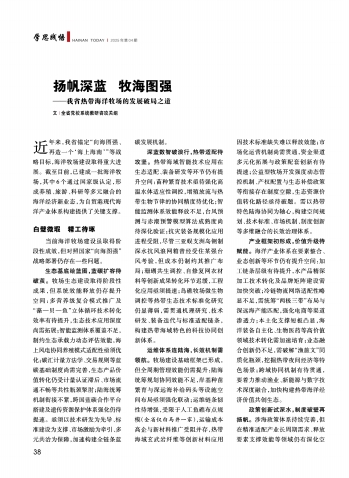 政策创新试深水,制度破壁再扬帆。涉海政策体系持续完善,但在精准适配产业长周期需求、释放要素支撑效能等领域仍有深化空间:财政支持机制的长周期适配性有待强化,深远海装备更新与种质保育等核心环节补贴覆盖面尚需扩展,热带海域风险缓释工具创新步伐亟须加快;金融支撑体系韧性不足,深远海专属金融产品供给缺位与巨灾风险共担机制尚未健全,一定程度制约社会资本参与活力;用海政策动态调适机制尚未贯通,海域使用金分类与复合用海需求存在阶段性错位,用海期限约束与规模化发展需探索动态平衡路径;休闲渔船标准迭代滞后于业态演进,海域立体产权改革等制度试点仍需加快落地步伐。海南应以自贸港制度创新为牵引,在“放管服”改革框架下推进涉海政策集成创新,激活产业跃迁新动能。