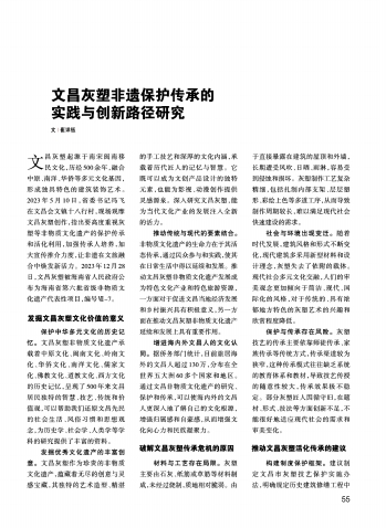 推动传统与现代的要素结合。非物质文化遗产的生命力在于其活态传承,通过民众参与和实践,使其在日常生活中得以延续和发展。推动文昌灰塑非物质文化遗产发展成为特色文化产业和特色旅游资源,一方面对于促进文昌当地经济发展和乡村振兴具有积极意义,另一方面在推动文昌灰塑非物质文化遗产延续和发展上具有重要作用。